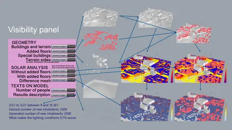 What would happen if there were one million new inhabitants in Munich? Urban densification is a problem of multiple facets, and apart from being a solution, can also cause numerous issues that have to be widely discussed and solved by interdisciplinary teams of specialists. As a small seminar project cannot possibly solve a major part of such a complex process by itself, is it only meant to be a visualization tool, helping envision ideas of urban growth. The main idea was to visualize an introduction of a desired number of people and optimization of the added volume considering the solar analysis. For this purpose, genetic algorithms were used.