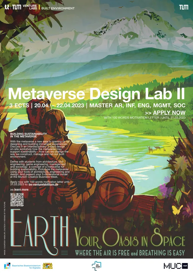 Discuss in an interdisciplinary three-days design workshop these questions. With support of the Bavarian State Ministry for Digital Affairs, the XR Hub Bavaria and MUC.XYZ we will work on-site in our TUM Venture Lab co-working space. Define a concept of a metaverse for Building Sustainability - How could the way we construct and run our buildings benefit from the metaverse. Prototype a low-entry idea of the metaverse using your tools of architecture, engineering and design. Present your 3-dimensional model at the MUNICH CREATIVE BUSINESS WEEK with leading experts from web3, gaming, 3D animation, visual effects, sociology, management and architecture.