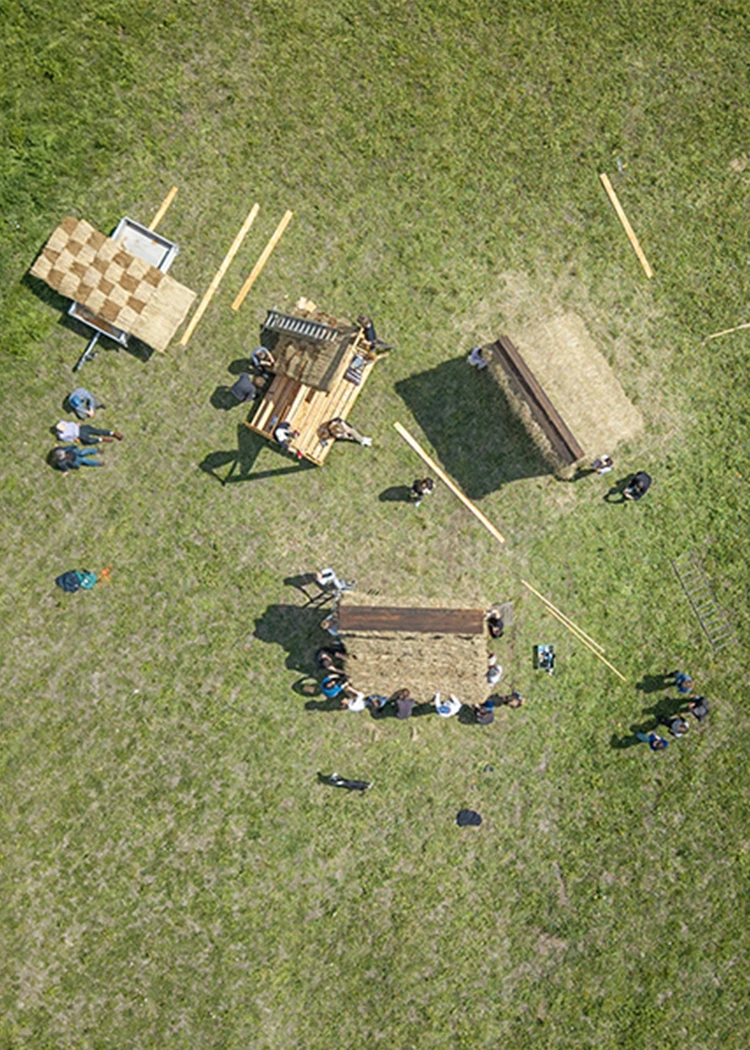 During a five-day workshop at the Wasserwerk site near Malchin, interdisciplinary student teams collaborated to design and build a pavilion using locally harvested Molinia and reed. The resulting structure consists of three distinct thatched modules. These modules were assembled on-site using low-tech tools and techniques, emphasizing hands-on learning and site-specific fabrication.
