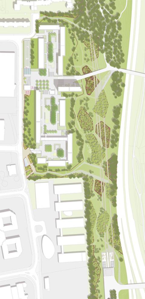 The "Olympia Press City" project is looking for design approaches that use open space design to enhance the quality of life in monofunctional residential structures.