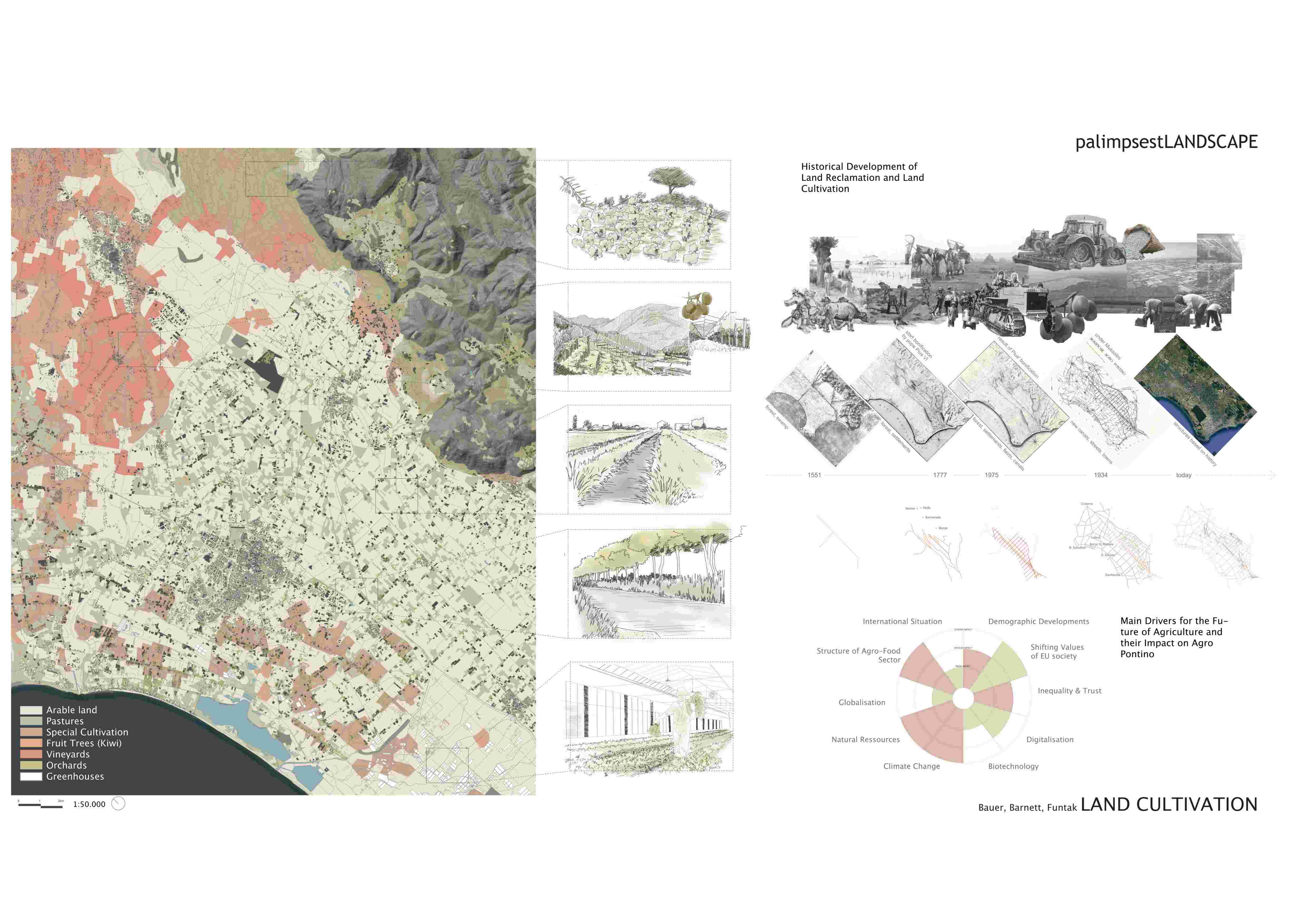The landscape can be understood as a palimpsest in which inscriptions have been made, some have been erased and new ones have been added. The Agro Pontino contains historical structures that seem to have fallen out of time - such as ancient relics, settlement centres from the medieval period or of the 1930s. But which space has a greater claim to existence, which is worth protecting? Relics of the marshland, relics of early colonisation or relics of land cultivation? Should they be set free so that they can be viewed - or should they be usable in everyday life today? The Via Appia, for example, has been preserved in its spatial structure, while its materiality has been adapted to today's needs.