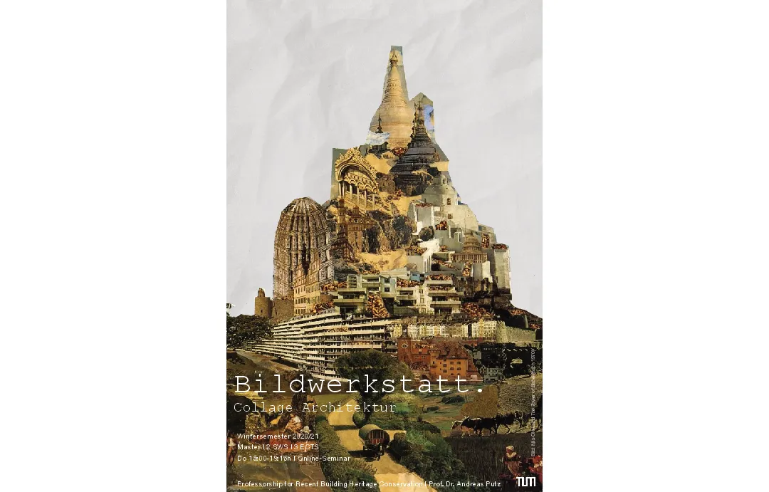 Das Seminar Bildwerkstatt ist eine begleitende Übung zum freien, wilden Denken und bildhaften Assoziieren. Mit den Mitteln der Collage nähern wir uns im Rahmen eines stegreifartigen Entwurfs von 12 Bildern intuitiv Fragen des Umgangs mit dem bereits Vorhandenen– dem as-found – als ideeller und materieller Ressource für eigene Narrative. Es geht uns um die Interpretation, Verfremdung, Einverleibung des Bestandes an (Vor-)Bildern, Ideen, Werken, Schnipseln und sonstigen Materialien in neue, zunächst befremdliche, aber spannungsreiche und letztlich sinnfällige Zusammenhänge. Auf diesem Weg entdecken wir: das Monument.