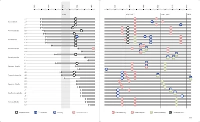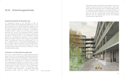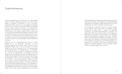 Abgesehen von den Wiederaufbauarbeiten nach dem Zweiten Weltkrieg ist bei den untersuchten Wohnanlagen eine erste Modernisierungsphase ab den 1970er Jahren zu erkennen. Weitere Maßnahmen erfolgten meist 20 bis 30 Jahre später. In der Regel handelt es sich bei den Gebäuden um drei – bis fünfgeschossige Mauerwerksmassivbauten mit Holzbalkendecken und Satteldach. Die Wohnungen sind als Zweispänner erschlossen und verfügen über zwei bis drei Individualräume, eine Wohnküche sowie eine Toilette. Neben der beständig gewachsenen Sozialstruktur liegen die Qualitäten des Bestands heute besonders in der zentrumsnahen Lage, den großzügigen Freiflächen sowie der Kompaktheit und Flexibilität der Wohnungen. In den genossenschaftlichen Anlagen der 1920er Jahre wurden die privaten Nutzungseinheiten durch verschiedene gemeinschaftliche Einrichtungen ergänzt – ein Konzept, das aktuell von vielen neu gegründeten Baugenossenschaften wieder aufgegriffen wird. Bei Anlagen aus den 1930er bis 1950er Jahren fehlt es jedoch oft an gemeinschaftsfördernden Elementen. Grund dafür war die wirtschaftliche Notlage. Zudem wurden wegen Baustoffknappheit und begrenzten finanziellen Mitteln ab den 1930er Jahren bauliche Standards in Bezug auf Wandstärken, Raumhöhen, Wohnungsgrößen und Fassadengestaltung stetig reduziert. Die Freiflächen in diesen Wohnanlagen sind oft wenig ausdifferenziert und werden dementsprechend kaum genutzt.