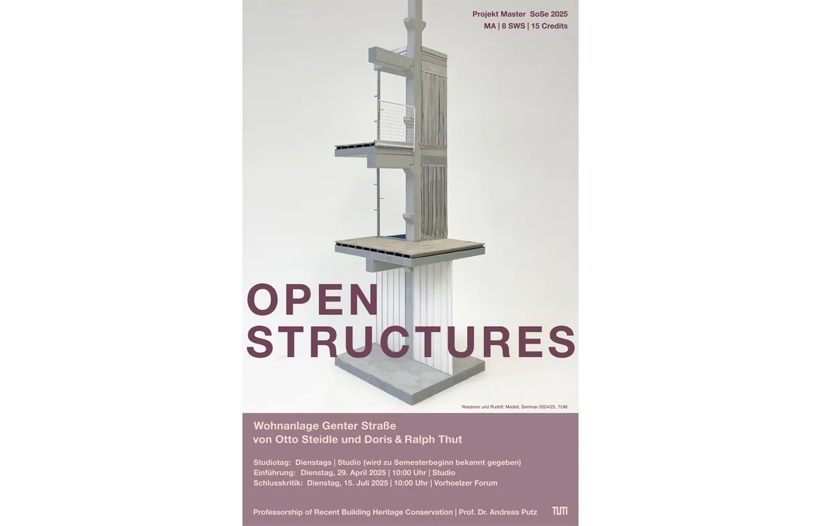 Im Sinne einer Machbarkeitsstudie sollen an einem frei gewählten Objekt konkrete architektonische Herausforderungen der Ergänzung, Erneuerung und Erhaltung untersucht und konstruktiv durchgeplant werden. Die Studie baut dabei auf einer detaillierten Recherche der Bau- und Transformationsgeschichte des Objekts, sowie der Dokumentation und Bewertung seines derzeitigen baulichen Zustands auf. Neue Anforderungen, bauliche Mängel und Qualitäten werden gemeinsam diskutiert und führen über den Vergleich von Varianten zu ausgearbeiteten konstruktiven Lösungen für die gestellte Aufgabe bis ins Detail.