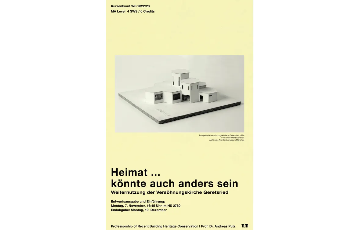 Geretsried ist die jüngste Stadt im Landkreis Bad Tölz-Wolfratshausen. Ehemals eine Lagersiedlung und Produktionsstandort für Sprengstoffe während des Zweiten Weltkriegs, danach Vertriebenenstadt, ist die Stadtgeschichte nicht ohne Zäsuren, was sich auch am Stadtbild ablesen lässt. Bis heute ist der Ort durch verschiedene Wellen an Einwanderung zur größten Stadt im Landkreis angewachsen. Aus dem Jahr 1970, als die erst 1950 neu gebildeten Gemeinde Geretsried zur Stadt erhoben wurde, stammt auch die evangelische Versöhnungskirche von Franz Lichtblau. Als Kirche wird das Bauwerk, dass einst als größeres Gemeindezentrum geplant gewesen war, heute so nicht mehr gebraucht. Aber der Bau selbst birgt Potentiale für neue Impulse, die auf die umgebende Stadt ausstrahlen sollen. Im Rahmen des Kurzentwurfs fragen wir nach den Potentialen für eine Weiternutzung, die sich aus der Realität und den Anforderungen des Ortes ergeben – und danach, welche baulichen Konsequenzen der Erhalt des Bauwerks mit sich bringt. Denn eines ist klar, Abbruch ist keine Option.